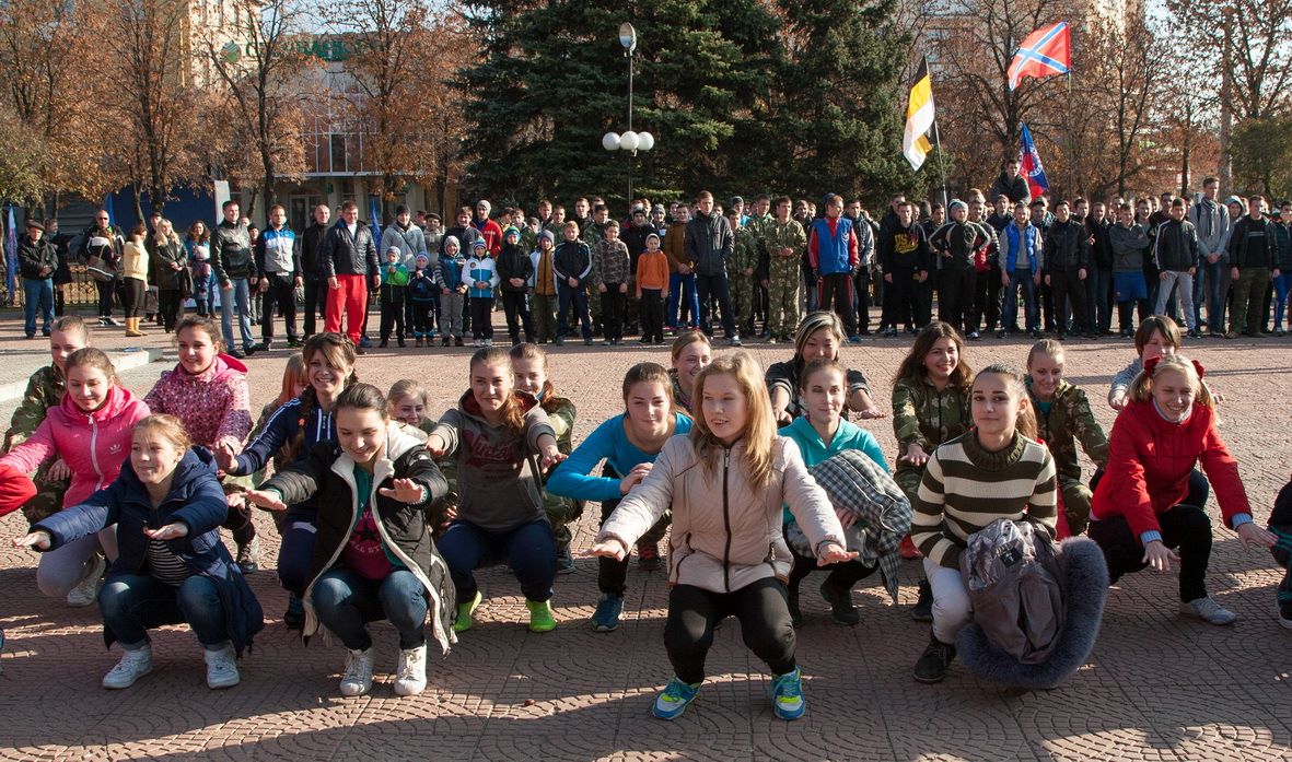 В День народного единства в Луганске активисты молодёжных организаций провели на центральной улице города пробежку с флагами. А также организовали «физкультминутку» возле памятника Шевченко.