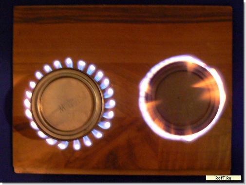 Ну не совсем конечно, теперь учимся ее разжигать. Надо залить спирта и закрыть крышку, 50 мл горит минут 15 и больше. Поставить на негорючую поверхность и слегка встряхнуть так, чтоб спирт через отверстия немного облил банку снаружи. Поджигаем спирт снаружи и ждем пока он выгорит. Повторяем процедуру до тех пор, пока у нас не получится самоподдерживающееся пламя из импровизированных форсунок вокруг банки. Обычно достаточно повторить 2-3 раза и все начинает работать само.