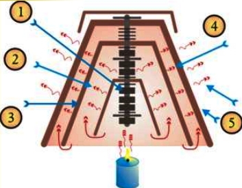 Лабиринтный колпак над пламенем собирает энергию и бережно накапливает её, нагреваясь довольно сильно (особенно раскаляется центральный стержень). А потом это тепло медленно передаётся воздуху всей поверхностью керамического радиатора.